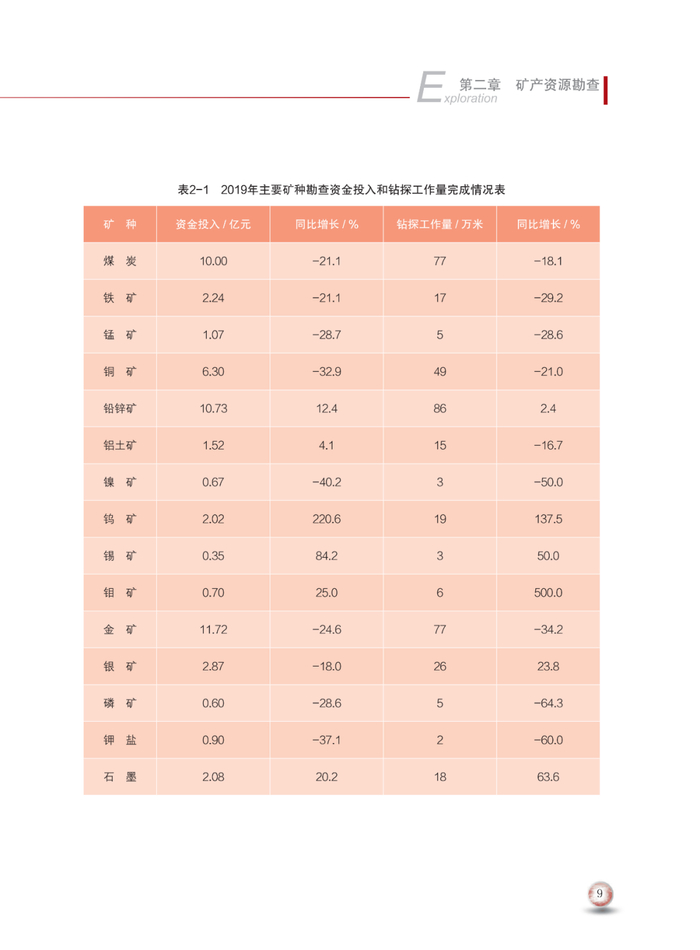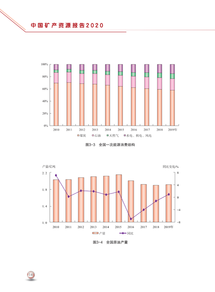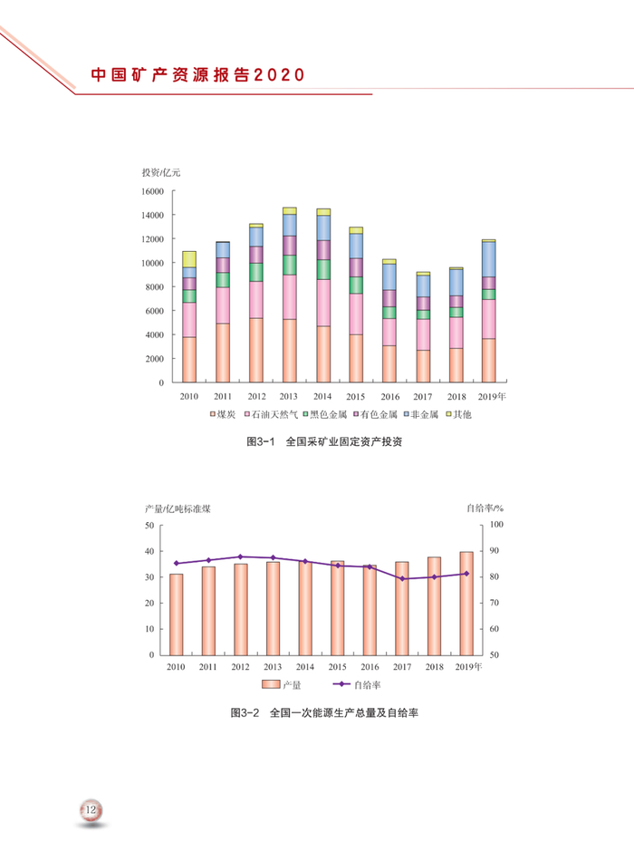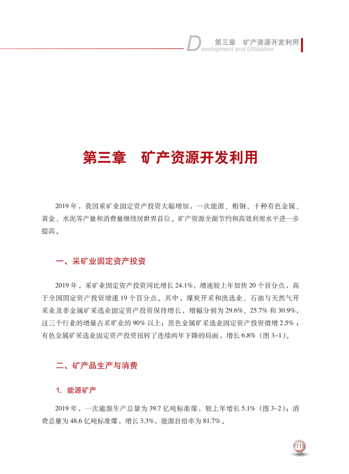 2019年,我国采矿业固定资产投资大幅增加,一次能源、粗钢、十种有色金属、黄金、水泥等产量和消费量继续居世界首位。矿产资源全面节约和高效利用水平进一步提高。