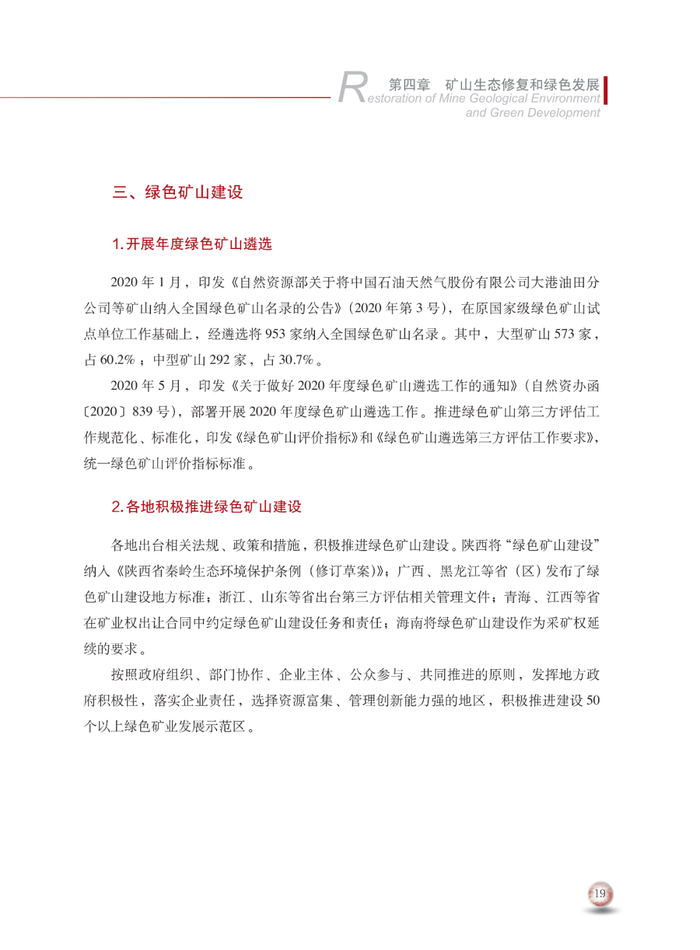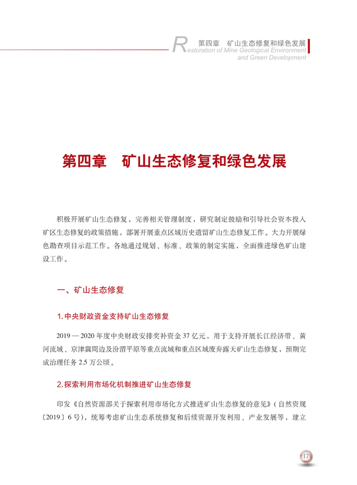 积极开展矿山生态修复,完善相关管理制度,研究制定鼓励和引导社会资本投入矿区生态修复的政策措施,部署开展重点区域历史遗留矿山生态修复工作。大力开展绿色勘查项目示范工作。各地通过规划、标准、政策的制定实施,全面推进绿色矿山建设工作。