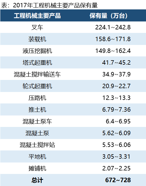 2017年,国内工程机械主要产品保有量在672-728万台,并且每年保持超40万台的增长速率。截至2019年底,国内工程机械主要产品保有量已超800万台。