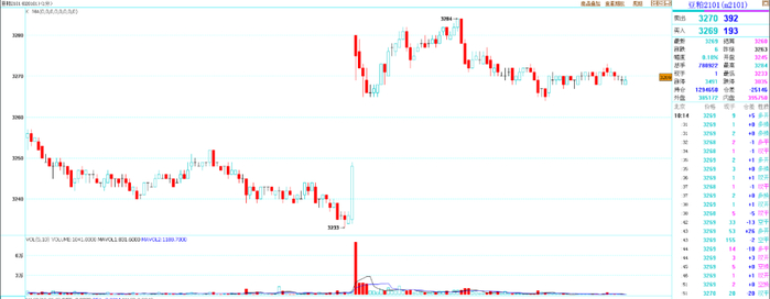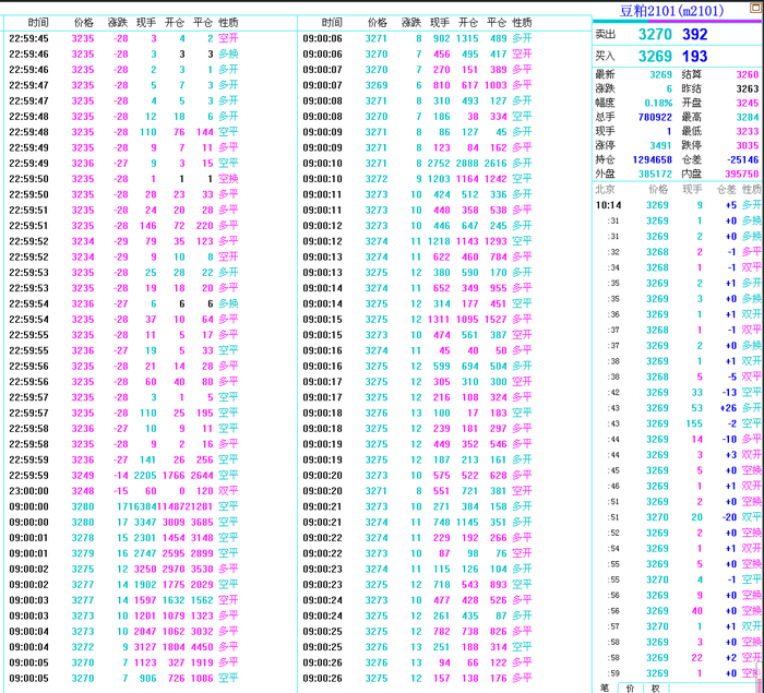 以豆粕2101合约为例:23日,时间戳23:00:00,收盘价格为3248元/吨。26日,时间戳09:00:00,价格为3280元/吨,较3248元/吨上涨32元/吨,该时点全市场成交量为16384手和3347手,即在3248元/吨和3280元/吨之间,全市场成交了19731手单子。