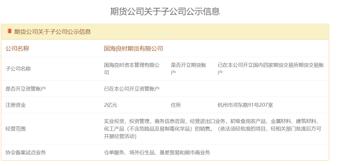 国海良时期货官网信息显示,公司旗下全资子公司国海良时资本管理的注册资金为2亿元。与国海证券新设的衍生品部业务开展范围有所重合,目前国海良时资本管理也在中期协备案了场外衍生品的试点业务,除此之外,还备案了仓单服务、基差贸易和做市商业务。