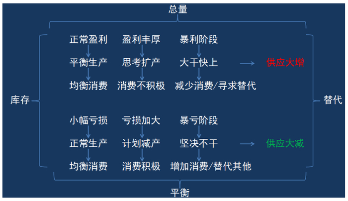 上图是加强版,在正常盈利阶段,生产比较平衡,消费也比较均衡,这时候很正常,不高也不低。在盈利丰厚阶段,原来1吨赚100元,现在1吨赚200元,生产者开始加班加点生产,并且有了扩产的欲望和想法,但消费者一看涨价了,消费开始不积极,这并不代表消费下降,消费者暂时还能承受目前价格,该吃吃该喝喝,但不会多买,够用就行。在暴利阶段,1吨赚上千元,这时候生产者大干快上,招工扩产,生产很积极。例如生猪,2018-2019年的时候,猪厂建得比五星级酒店还好。但因为价格很高,消费者开始减少消费,寻求替代,猪肉贵了,就换成吃鸡蛋、吃鱼,或者不吃、少吃。生产商生产积极,消费者消费不积极,供应大增,转折点就来了。