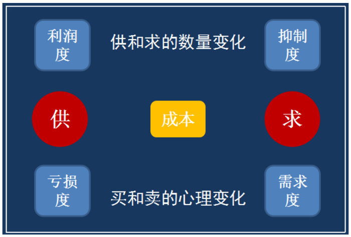 上图是计算行情的方程式,大家可能感觉比较抽象,我慢慢剖析。供求、成本、利润度、亏损度、需求度、抑制度、供和求的数量变化、买和卖的心理变化,这就和魔方一样,不过它的演变是有规律的,万古不变。供在成本的基础之上,供的一方就是生产者,随着利润度的上升,生产动力就会上升,未来的供应数量就会不断加码。需求的一方就是消费者,随着利润度的上升,生产动力的加强,消费者的购买度在不断降低。非常简单,大家都知道这个道理,就是没有仔细想过。供随着利润度的上升,生产动力越来越强,求随着价格的上涨,消费欲望越来越低。也就是说,供应一方,随着亏损度的加大,生产动力越来越低迷,需求的一方正好反过来,随着价格的不断降低,消费欲望越来越高。这就演变到了一个点,就是物极必反,随着时间的推移一定会达到一个度,供和需严重失衡以后,转折点就出来了。要把握住这个规律的核心,这就是分析行情趋势的方程式。非常简单,但没有人讲过这个问题,教科书也没有写过这个问题,我们也知道这个道理,就是没有专门列出来。本质原因就是这样,没有多么复杂,很好理解,大道至简。