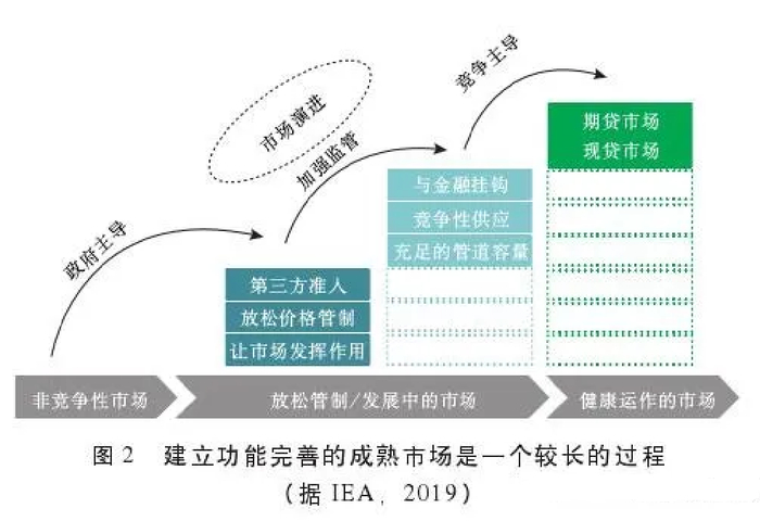 不同国家和地区推动天然气市场化改革进程的速度各异,各国的市场基础也千差万别。但改革的共同目标都是促进竞争和增加市场流动性,并最终使终端用户受益。还有一个共同点,就是改革都经历了一个较长的过程,每一步改革都与当时的天然气发展阶段相适应,见图2。