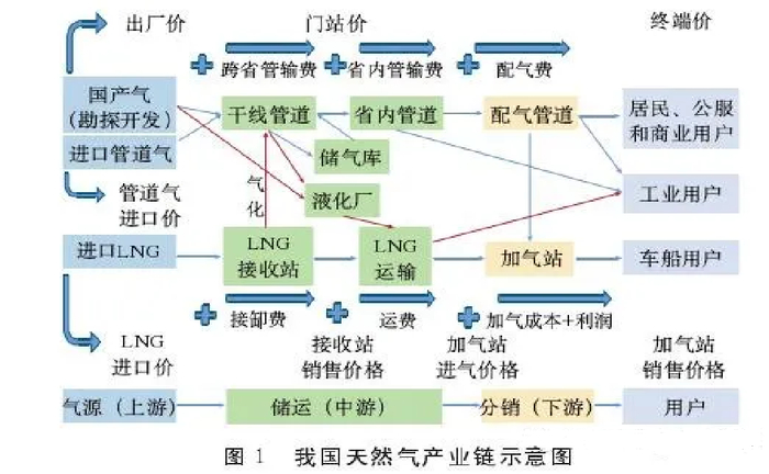 我国天然气产业链包括气源(上游)、储运(中游)和分销(下游)三个环节。气源包括本土勘探开发生产的国产气及通过管道进口的管道进口气和海运进口的LNG,储运环节包括干线管道、省内管道、储气库和LNG槽车及罐箱运输,分销环节包括城市配气管网和加气站等,见图1。