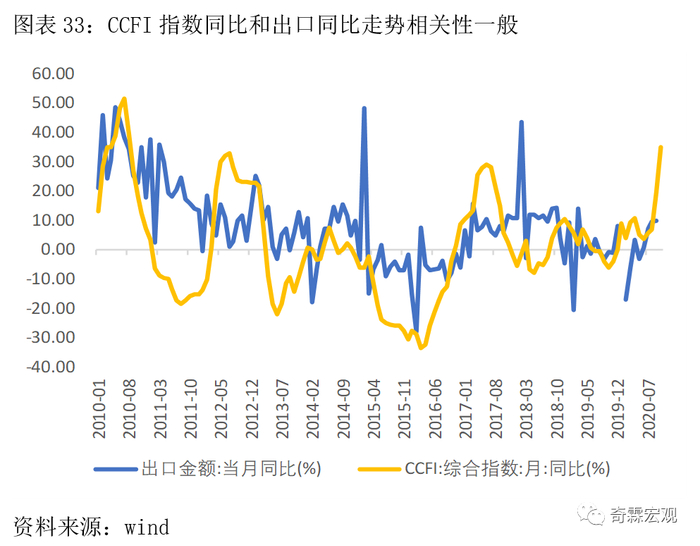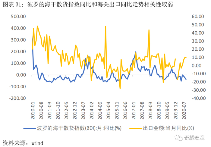 逻辑上是如此,但是比较遗憾的是,从短期来看BDI月同比对我国出口同比变动方向的预测成功率,只有50%左右。所以它只能是作为判断全球经济景气度的一个简易指标,不是很适合直接用于预测出口。