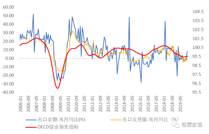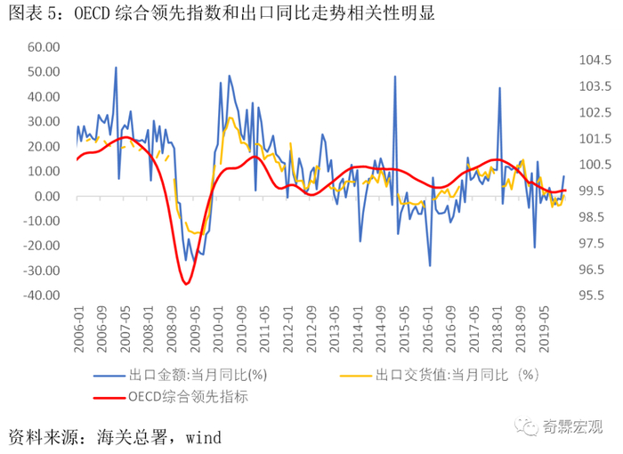 OECD综合领先指标可以粗略地反映全球经济状况,我国出口同比和它的周期波动,有着很高的一致性。