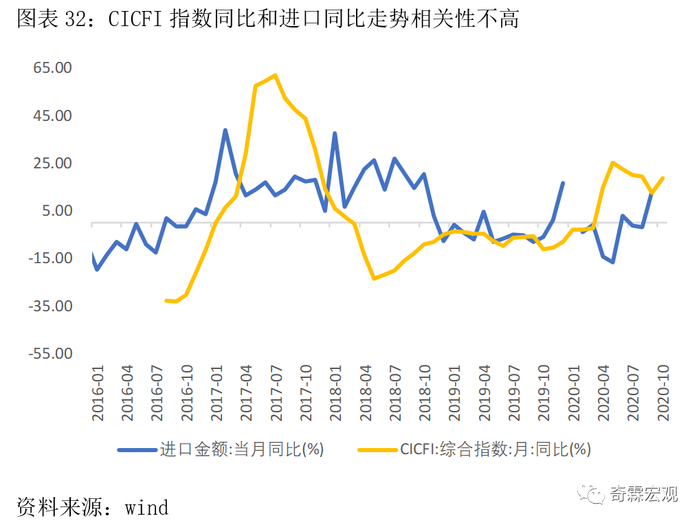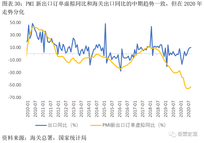 PMI本质上是一个环比数据,我们可以将PMI新出口订单指数转化为虚拟同比,然后再与出口当月同比进行比较。进口同理。