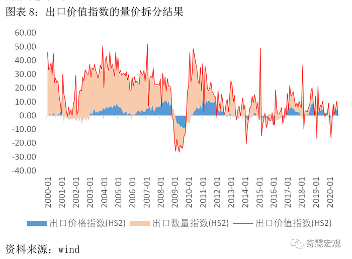 可以看出,进口商品的价格变动,对进口金额造成影响较大(图9)。而出口增速受价格变动的影响要更小一些(图8)。