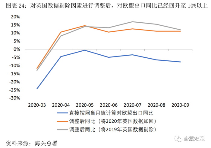分国别来看,9月对美国、东盟出口增速提升至20.5%和14.4%的高位,这两者构成了最主要的支撑力量,但对欧盟、日本出口增速则分别下滑至-7.8%和-2.7%,拖累整体出口(就算考虑了英国数据剔除因素,修正后的对欧盟出口增速也在走低)。