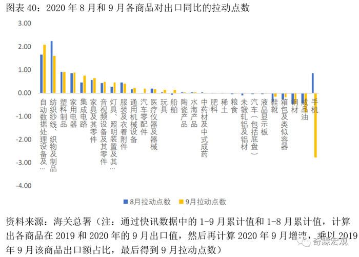 而手机出口增速则从23.3%大幅下滑至-42.5%,导致拉动点数明显转负,拖累整体出口。原因有二,一是在于上年同期有高基数,二是可能和原本应在9月发布的苹果手机秋季新品推迟到10月有关(中国的苹果代工厂在9月无法出货)。手机出口的恶化,很大程度上解释了9月高新技术产品出口增速的下行。