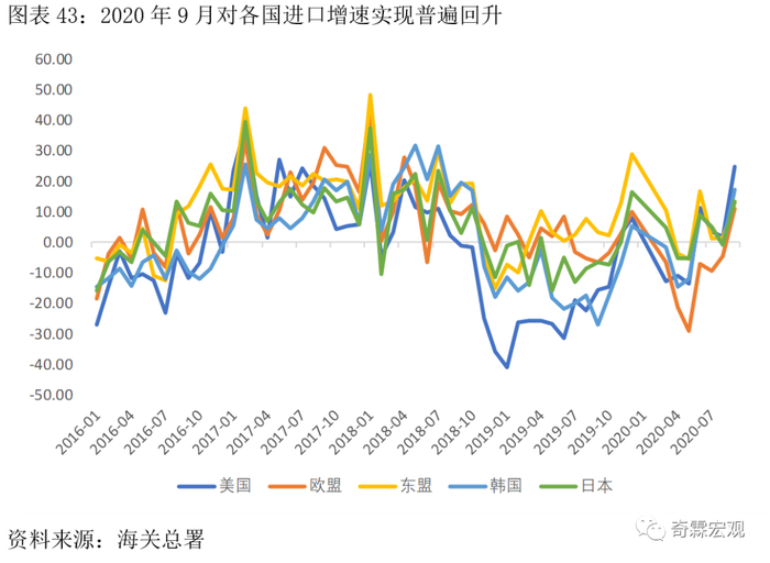 分国别来看,9月我国对各主要国家/地区的进口增速实现普升,进一步说明了进口的改善来自于中国自身内需的扩张。