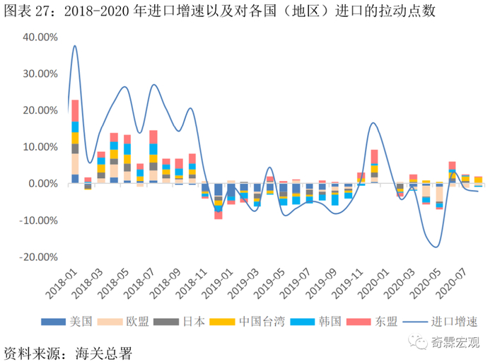2018年进口增速维持高位,对欧盟、台湾、韩国、东盟进口比较均匀地起着拉动作用。2019年进口增速大幅下滑,对美国、韩国进口是关键的拖累项。2020年,中国进口增速同样维持低位,其中对欧盟进口则是主要拖累项(尤其是在4-5月)。