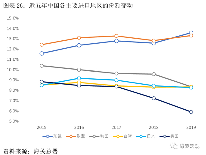 而韩国、台湾、日本、美国的占比则呈现下行状态。特别是对美进口占比,在2018-2019年明显跌落。
