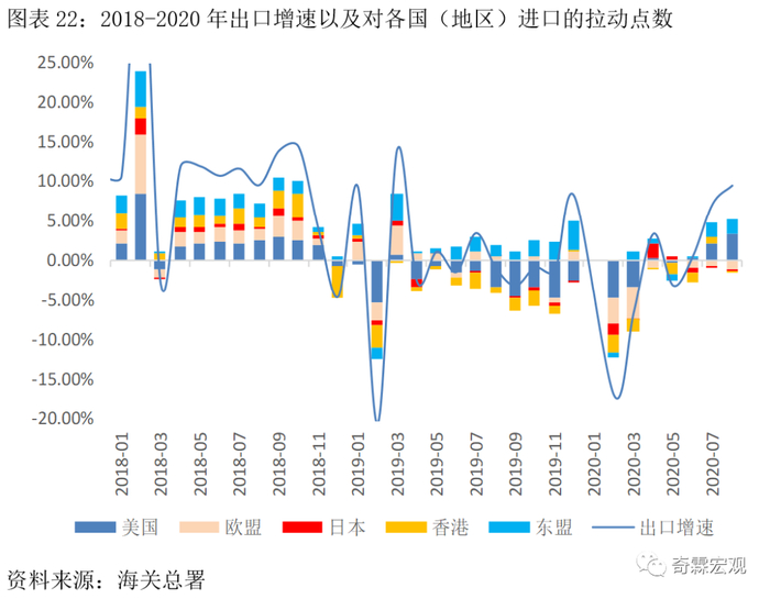 对美出口快速上行,部分原因在于上年同期基数走低。而对欧盟出口同比回落,可能和9月欧洲疫情再起、防疫措施趋严导致经济修复放缓有关。