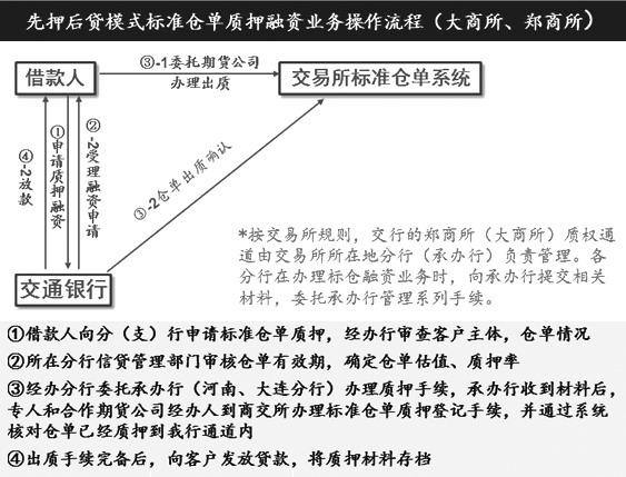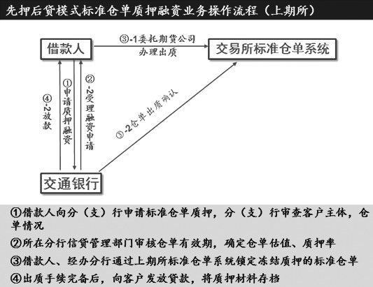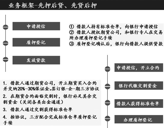 “先押后贷”,是指借款人将标准仓单通过期货交易所质押到银行名下后,银行按标准仓单评估价值的一定比例向借款人提供融资,?该模式主要针对持有标准仓单的卖方企业客户。“先贷后押”,是指借款人通过期货交割或协议转让方式购买期货交易所上市交易品种的标准仓单时,银行按标准仓单评估价值的一定比例向借款人提供融资购买仓单,同时借款人将所购仓单质押给银行,该模式主要针对有标准仓单交割需求的买方企业客户。以交通银行为例,两种模式的业务框架及操作流程如下图所示: