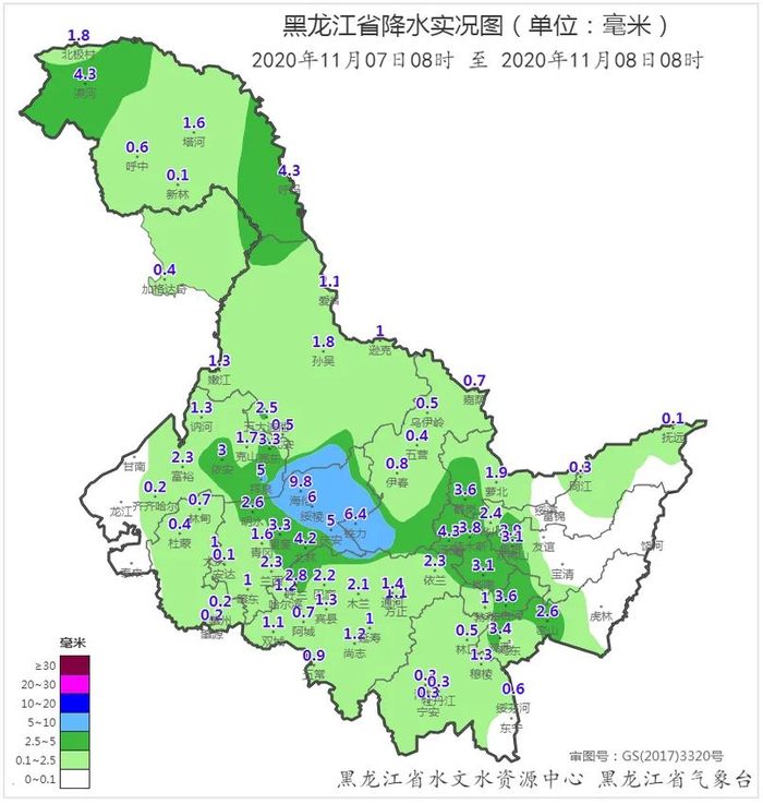 其中海伦、拜泉、绥棱、铁力、庆安降大雪