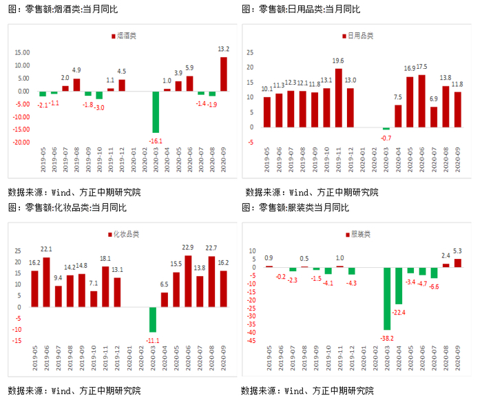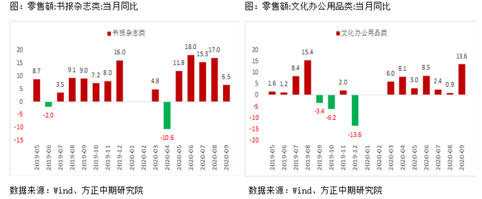 造纸行业从2018年9月开始主动去库存,2019年二季度开始逐步进入被动去库存阶段,在年底出现了主动补库,伴随就是白卡纸和文化纸现货价格在2019年4月开始陆续止跌反弹,并持续至2020年2月,但疫情打乱了库存周期节奏,今年二季度市场出现阶段性被动补库,纸张价格在4-5月出现一轮大幅下跌。因此,国内造纸行业补库存周期随着疫情影响结束,可能会再次开启,与2017年开始的一轮主动补库相比,当前库存水平明显较高,产成品库存增加20%以上,产成品以外存货增加6%-8%,因此补库力度可能小于上一轮。2017年开始的主动补库阶段,白卡纸,文化纸涨幅达40%,2020年6月至今,国内白卡纸上涨超过20%,文化纸涨幅较小,在10%以内。同时,从卓创统计的社会库存数据看,除生活用纸偏低外,其他木浆纸社会库存均在最近四年高位,白卡纸则是新高。因此,后期补库强弱取决于明年需求情况,疫情的影响并未结束,欧洲防控措施多在10月下旬开始,因此11月之后的需求不容乐观。但10月的PMI数据,还是体现出疫情影响减弱后,海外经济复苏的潜力依然较大。国内消费恢复加快,前期公布的9月数据显示出,主要下游如烟酒类、服装鞋帽、化妆品类等零售额增速继续改善,线下消费也在好转,国内经济正常化,消费成为了后期接棒投资带动经济回升的主要力量,还是值得期待。