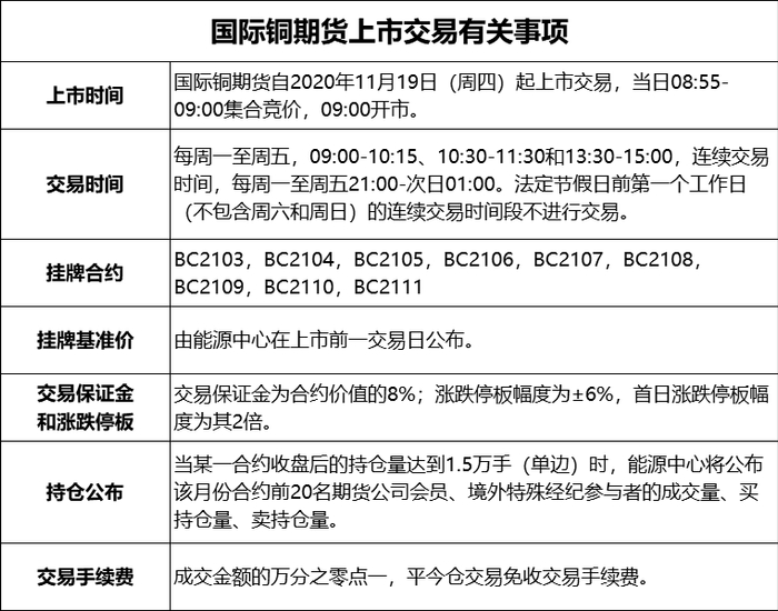 根据上期能源发布的通知,国际铜期货自2020年11月19日(周四)起上市交易。当日08:55—09:00集合竞价,09:00开市。