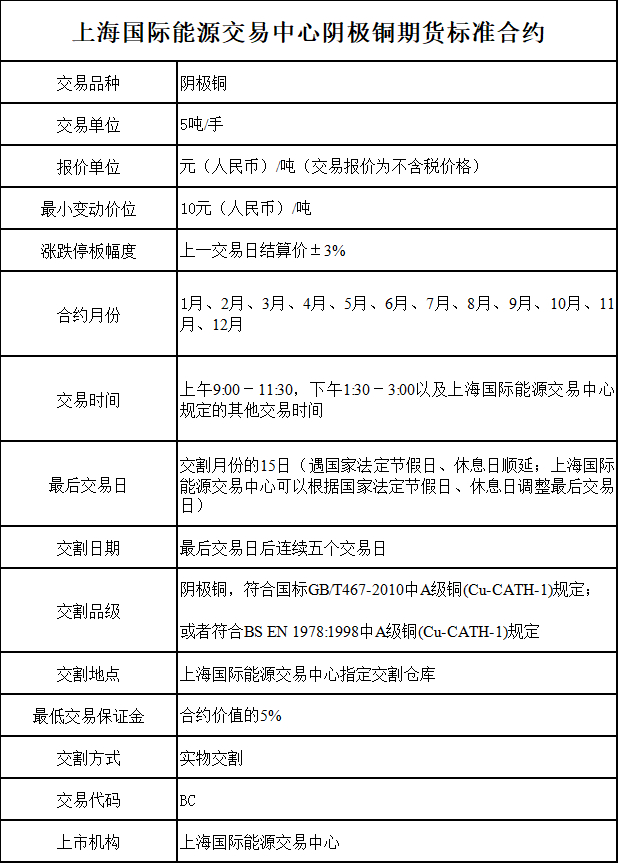 一是国际铜期货价格不含增值税,合约交易单位为5吨/手,最小变动价位为10元/吨,涨跌停板幅度为上一交易日结算价±3%,最低交易保证金为合约价值的5%,合约交割月份为1—12月,交割日期为最后交易日后连续五个交易日,交割单位为25吨。