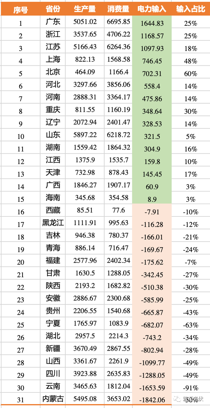 表:2019年各省电力的生产、消费量(单位:亿kWh)