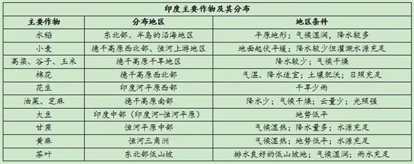 印度雨季生长的作物主要有水稻、谷物、花生、大豆、棉花、甘蔗等,凉季生长的作物包括小麦、油莱、马铃薯等。