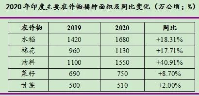 根据季风的到达时间,印度秋季农作物的播种时间通常在6月初至7月底,而今年提前的半个月雨季带来了超预期的降雨量,印度秋季作物的播种面积也较去年大幅提升。印度农业部7月下旬的数据显示,2020年印度秋季农作物播种面积达6920万公顷,与去年同期相比增长21.2%。部分品种如油菜籽播种面积甚至创下历史记录。