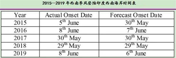 根据印度气象局预测,2020年度西南季风登陆印度西南部的时间在5月22日前后,而过去5年里西南季风大多在5月29日至6月8日之间到来。2019年西南季风实际登陆印度西南海岸的时间为6月8日。换言之,今年印度西南季风较去年提早了2周左右。