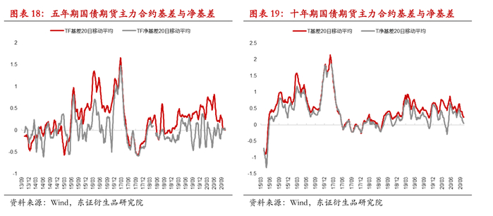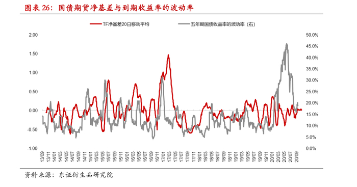 2020年国债期货的市场活跃度处于一个不断攀升的状态,前10个月平均来看,十年期国债期货持仓在10万手左右,五年期国债期货持仓量在5万手左右。前五大机构投资者的立场作为市场主流机构参与者的近似代表,对于十年期国债期货,净持仓占比多数时间为负,反应主要机构投资者对于期债的参与需求可能主要以套保为主。近年以来期货随着市场容量的上升与套利策略的成熟,套利机会不断收窄,净基差的波动性也明显下降,期限联动关系进一步提升。