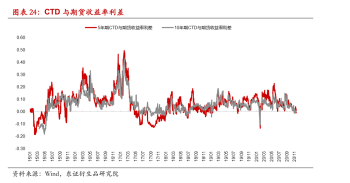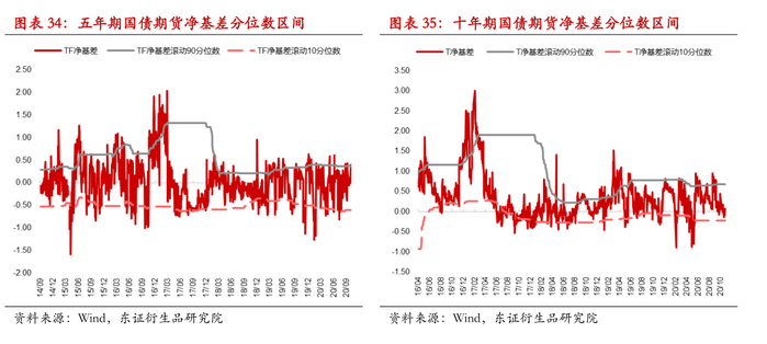 历史长国债期货基差的走势方面,2013年至2015年国债期货上市初期,期货估值偏高且流动性较为有限缺乏足够的套利资金参与,净基差多数处于负值状态。此外,历史上期货合约制度变更也对短期基差走势产生了较大冲击,例如从TF1512开始中金所下调可用于交割的国债的最大期限,由此前的4-7年调整为4-5.25年,随着可交割债券数目下降,转换期权价值降低,净基差大幅走低。近年以来期货随着市场容量的上升与套利策略的成熟,套利机会不断收窄,净基差的波动性也明显下降。