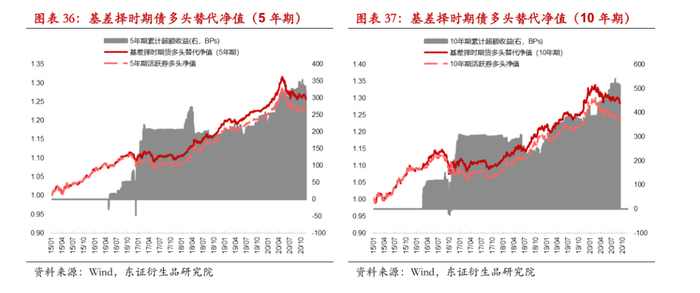 基于五年期与十年期国债期货与活跃券现券持仓的多头替代策略设计方面,我们基于净基差滚动一年分位数来衡量期货价格相对偏离程度,当净基差大于等于90%分位数则将卖出现券买入国债期货,否则我们保持现券多头持仓。结果显示基于基差择时进行多头替代在五年期与十年期国债期货上均具有长期稳定的超额收益,十年期相对贴水幅度更深,因而超额收益更为客观。经测算,基于2015年至今的回测结果来看,10年期基于基差择时期货多头替代(含票息)实现年化收益6.6%,现券多头年化(含票息)收益5.5%,进行期债多头替代后相对年化超额收益128bp;5年期基于基差择时期货多头替代(含票息)实现年化收益6.0%,现券多头年化(含票息)收益5.3%,进行期债多头替代后相对年化超额收益80bp。