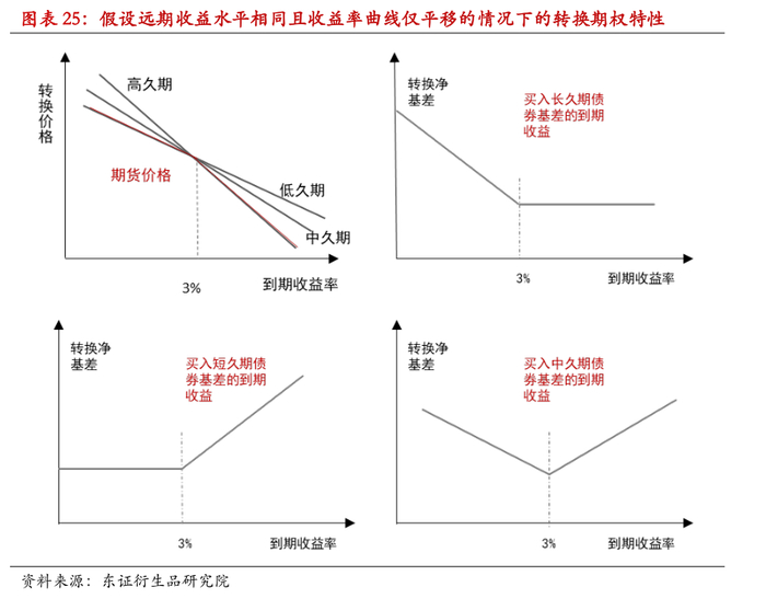 可交割券篮子中包含不同久期的债券,其相对强弱关系主要取决于利率水平,因而国债期货基差的定价镶嵌了一个利率期权,当利率曲线上移国债期货卖方可以选择长久期债交割,曲线下移可选择短久期债交割。因而长久期券的净基差可以理解为利率的看跌期权(债券看涨期权),短久期券的净基差是利率看涨期权(债券看跌期权),中久期券的净基差是利率跨式期权(债券跨式期权)。在远期收益水平相同且收益率曲线仅平移的理想情况下的转换收益率位于3%左右,实际情况下远期收益率水平不同一般呈现陡峭化的曲线,对应转换收益率下降,反之若曲线平坦化对应转换收益率上升。