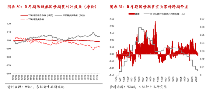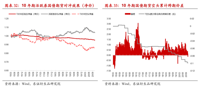 我们采用基点价值法对相应期限的活跃券进行空头套保,测算期债升贴水、动态调整套保比率带来的交易成本对套保效果的总体影响,考虑千分之一的交易冲击成本后,基于2016年至2020年的回测区间内,5年期国债贴水产生对冲成本约为年化0.8%,对冲后组合年化波动率为0.82%相对于对冲前现券多头(净价)2%的波动率显著下降,10年期国债贴水产生对冲成本约为年化1.8%,对冲后组合年化波动率为1.2%,对冲前现券多头(净价)波动率为3.3%。