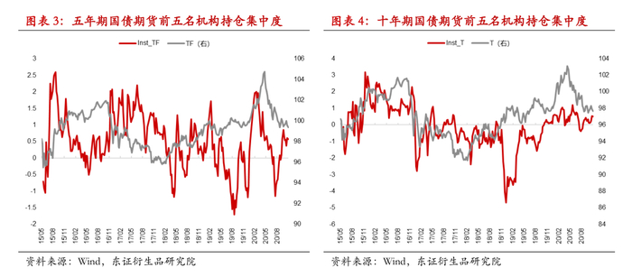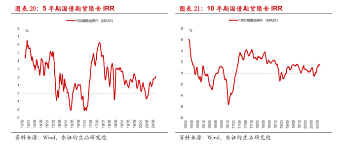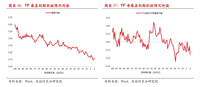 我们基于中金所披露的持仓量数据计算的前五大机构投资者净持仓占比,将前五大机构投资者的立场作为市场主流机构参与者的近似代表,对于十年期国债期货,净持仓占比多数时间为负,反应主要机构投资者对于期债的参与需求可能主要以套保为主,而五年期国债期货净持仓占比在零上下波动率,并没有特别一边倒的倾向,机构持仓信息也与不同期债品种基差走势体现出的信息相一致,十年期国债期货平均贴水幅度在三个品种中往往是最大的,或主要由于机构投资者对于长债的空头套保需求与多头需求不匹配导致。