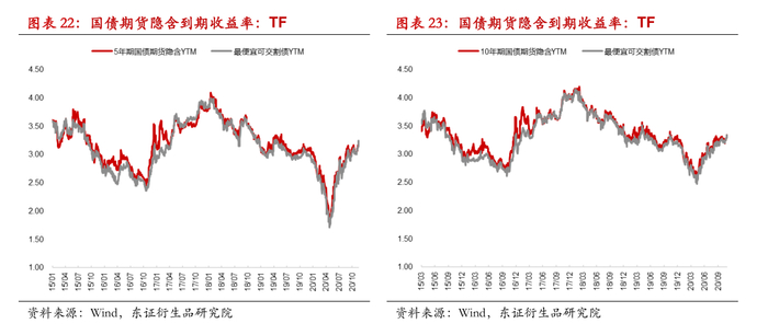 除了基差与净基差,国债期货与现券的联动关系还可以从其他角度去衡量。首先,我们从期货与现券的套利交易出发,定义隐含回购利率(IRR)为买入可交割券并卖出转换因子(CF)倍的国债期货到期交割对应的回报率,不同可交割券对应的IRR不同,IRR越大说明相对于国债期货价格现券的定价越便宜,IRR最大的可交割券即为最便宜可交割券。其次,国债期货也具有隐含收益率(YTM),国债期货的隐含收益率需要结合最便宜可交割券去计算,一般计算方法为CTD在第二交割日基于当前国债期货价格乘以转换因子作为净价所对应的到期收益率。直观上去理解期债的隐含收益率,在假设CTD不变的情况下,我们通过期货头寸锁定未来现券的远期价格,例如我们10年期国债主力合约价格97.315元,对应期货市场隐含了CTD券在交割日的远期净价为97.315元,根据这一远期价格我们可以得到的到期收益率即期债隐含的到期收益率。一般情况下期货隐含到期收益率与CTD的到期收益率走势较为接近,其收益率利差从另一个维度衡量了期货相对现券定价的强弱,与净基差涵义一致。