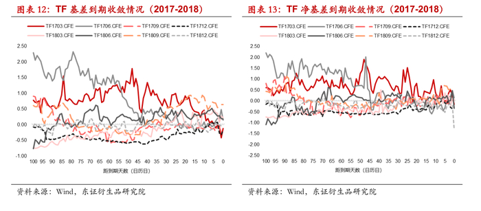 此外移仓换月行为对国债期货跨期价差具有较大的影响,一般当IRR较高时,由于空头获利较多更倾向于进入交割,导致多头主导移仓,可能导致跨期价差上升,反之则跨期价差降低,基差水平与跨期价差的分析是相互结合的。