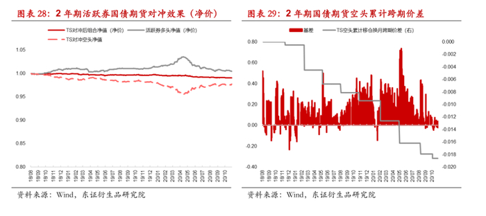我们采用基点价值法对相应期限的活跃券进行空头套保,测算期债升贴水、动态调整套保比率带来的交易成本对套保效果的总体影响,考虑千分之一的交易冲击成本后,从期债上市至今,基于两年期、五年期、十年期国债期货进行相应期限活跃券的对冲得到总的对冲组合年化对冲成本(不含票息)分别为0.19%、0.28%和0.99%。2年期国债期货基差影响较小,整体对冲成本较为有限,10年期国债期货平均贴水程度较深,对于空头套保效果有一定影响。考虑到因不同期债品种上市时间不同造成的回测区间差异对年化对冲成本结果的影响,2015年之前期债基差常为负值,对冲具有一定的超额收益,但之后基差逐渐由负转正,基于2016年至2020年的回测区间内,5年期国债贴水产生对冲成本约为年化0.8%,对冲后组合年化波动率为0.82%相对于对冲前现券多头(净价)2%的波动率显著下降,10年期国债贴水产生对冲成本约为年化1.8%,对冲后组合年化波动率为1.2%,对冲前现券多头(净价)波动率为3.3%。