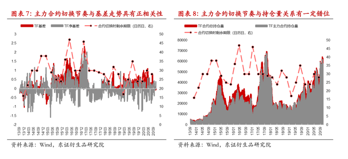 国债期货主力合约切换时点有一定的规律,我们按照持仓量最大的原则定义期债主力合约切换时间,其一般在距到期20-50日波动。主力合约的切换与基差走势呈现一定的正相关,其背后的原因可能是,国债期货的主力资金是机构套保参与资金,当季合约贴水较大时空头主导移仓,相应的基于持仓量计算的主力合约发生较早地切换;当季合约贴水较小甚至为升水,空头可以等待基差到期进一步收敛再进行移仓。