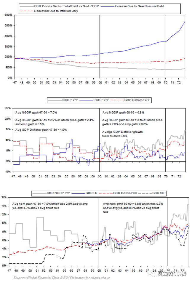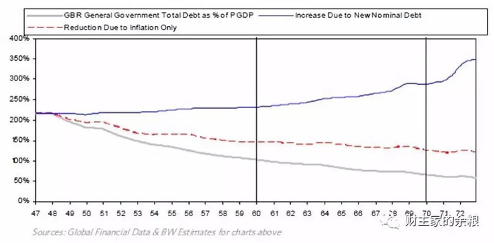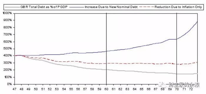 战后总负债的减少是因为实施了这些政策使得名义GDP的上升超过了新借款的增幅。由于GDP增长, 1947-1970年通货膨胀为4%左右,这使得债务占GDP比重降低了2/3,如下表所示。
