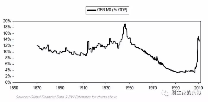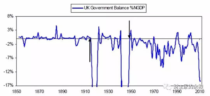 下表显示自1850年政府预算赤字占GDP比重。政府预算赤字主要会在以下两种情况迅速扩大:1)去杆杠化过程中。政府支出不断增加以抵消逐渐减少的私人部门支出;2)战争期间。请注意两次战争造成的影响,同时也需注意目前预算赤字占GDP的比重是自二战以来最高比重(因为去杆杠的作用)。