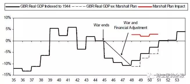 简单来说,在二战后英国实际已经破产而美国经济逐渐走强。所以美国实行了马歇尔计划,而大英帝国崩溃后英国开始了长期去杠杆化的过程。下表显示英国经济的崩溃以及在马歇尔计划的帮助下得到一定程度的减缓。