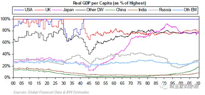 • 在二战开始前,除了日本以外的其他发达国家,人均收入水平一般都是最高收入国家的70%左右。总收入最高的国家一般也是货币储备国,作为货币储备国收入上可以获利,这点随后会进行说明。这也是造成其他发达国家与最高收入国家(20世纪中期前的英国和之后的美国)收入存在显著差距的原因。需关注二战如何使得其他发达国家收入下降至仅是最高收入国(美国)的40%。在二战后的25年间,这些国家的人均收入水平才恢复到正常的70%-80%。