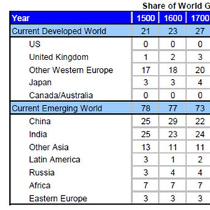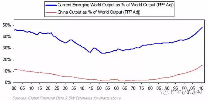 下表显示自1900年新兴国家经济占世界GDP比重的变化,以及中国占世界GDP比重的变化。如下表所示,新兴国家作为一个整体,其占世界经济比重从1950年就开始有所增加,而中国所占份额直到1980年才开始增加。