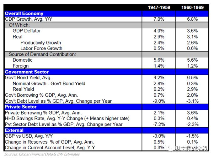从上表中可以看到,债务占GDP比重从1947年的400%左右跌落到1970年的150%左右。这是如何发生的?如前所述,在去杠杆化过程中,名义利率必须维持在名义GDP增长率的水平之下(否则即使并没有增加信贷来满足不断上升的消费支出需求,债务占收入比重也会上升),同时实际利率也必须维持低水平,货币增长率才会上升,货币也才会贬值。下表显示去杠杆化过程中最重要的部分是如何发生的。因为不同的时段存在略微差异,因此我们将其分为两个部分:自1947年至1959年,与1960年至1969年。