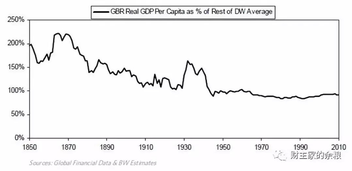 • 在二战结束前,英国的人均收入位居第一,其后被美国取代,这象征着大英帝国的没落和美帝国的崛起。我们随后会对此进行说明。
