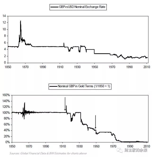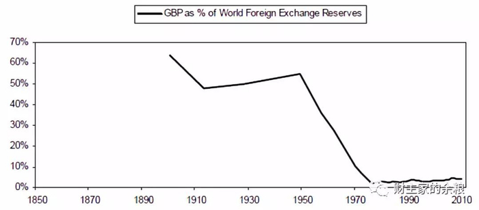 下表显示自1900年(占比超过60%)起英镑占国际货币储备比重的变化趋势。需要注意的是英镑占比直到1950年止都超过50%,然后在接下来的50年间迅速下降至5%左右。如前所述,当帝国处于巅峰期,它们的货币成为储备货币,于是可以超额借贷,而过度的超额借贷最终导致其经济衰退。