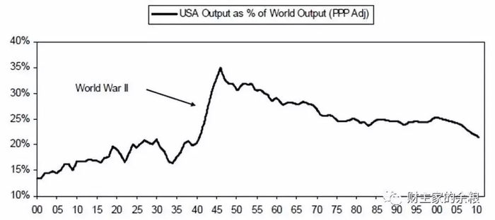 下表显示自1900年开始美国经济占世界GDP比重。图表数据显示了二战期间相对其他多个被战争重挫的国家(e.g.欧洲、日本、中国和俄罗斯),美国占世界GDP比重超乎寻常地高,随后才逐渐回归较正常的水平。除了因为战争使得美国获得相对优势的地位,近些年某些国家(中国、俄罗斯和印度)由于其无效的经济体系和/或官僚政治,经济复苏速度较正常水平缓慢。
