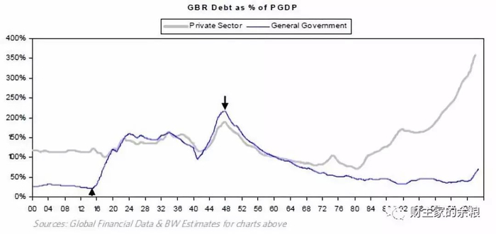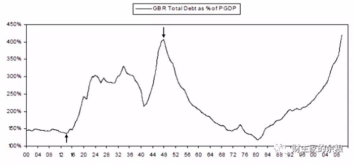 下表显示总债务占GDP的比重。请注意有两个大的上升波动:从1914年起开始上升到1947年达到顶峰,代表大英帝国的衰退期。此外,需注意的是现在的美国与其是何其相似。