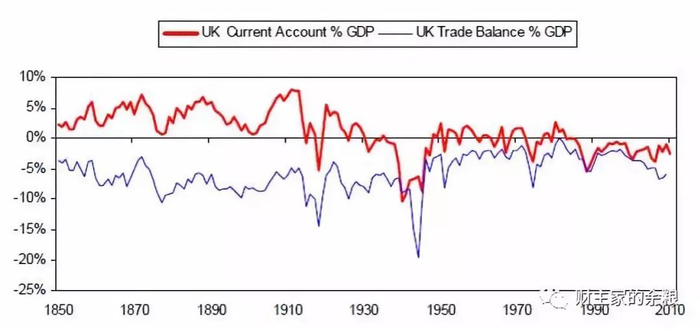 下表显示自1850年起英国经常账户和贸易收支平衡的变化情况: