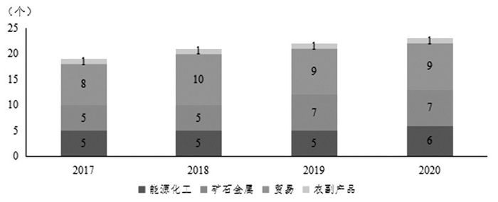 我国交易商的行业分布与全球整体状况有所不同。第一,约有四成交易商集中在贸易行业,但其总营收仅占我国上榜交易商营收总和的约25%。第二,约25%的交易商为能源化工企业,但其总营收则超过我国上榜交易商的50%。第三,矿石金属行业的交易商数量近年来有小幅增长,已超过能源化工类交易商,但其总营收仍然较少。第四,长时间来我国仅有1家主营农副产品的企业(中粮集团有限公司)上榜,数量和营收占比均低于全球同行业水平。